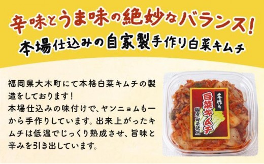 福岡県大木町にて本格白菜キムチの製造をしております!本場仕込みの味付けで、ヤンニョムも一から手作りしています。出来上がったキムチは低温でじっくり熟成させ旨味と辛みを引き出しています。辛みとうま味の絶妙なバランスの白菜キムチをぜひご賞味ください! 【原材料名】 白菜キムチ:白菜(国産)、大根(国産)、漬け原材料[唐辛子、にんにく、魚醤、しょうが、砂糖、だし(鰹・昆布)、食塩、 ごま]/調味料(アミノ酸)、(一部に小麦、大豆、ごまを含む