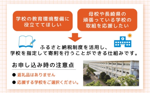 「母校や長崎県の頑張っている学校の取組を応援したい」、 「学校の教育環境整備に役立ててほしい」という方がふるさと納税制度を活用し、県立の中学校や高等学校、特別支援学校を指定して寄附を行うことができる仕組みを設けております。 皆様のあたたかなご支援をよろしくお願いいたします。 なお、各学校の寄附の活用内容については下記で検索ください。 「長崎県教育委員会 ながさきの学校応援寄附金」 ※このプロジェクトにご寄附いただいた場合、返礼品はございません。ご了承ください。 お礼の品なし 寄附のみ 寄付のみ 長崎 中学 高校 学校 地域 応援 母校 教育 環境