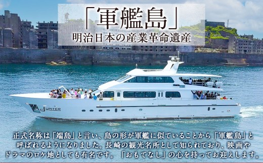 明治日本の産業革命遺産の「軍艦島」。\\n正式名称は「端島」と言い、島の形が軍艦に似ていることから「軍艦島」と呼ばれるようになりました。\\n\\n「軍艦島コンシェルジュ」の場所は乗り場から「グラバー園」や「大浦天主堂」、「オランダ坂」等観光名所も近いので長崎観光には最適です!\\n「軍艦島」は長崎の観光名所として知られており、映画やドラマのロケ地としても有名です。\\n\\n「軍艦島コンシェルジュ」では、世界遺産登録された軍艦島の上陸ツアーを行っております。\\nお客様に最高のサービスを提供する為「おもてなし」の心を持ってお迎え致します。\\nツアーの前には、『軍艦島デジタルミュージアム』へ行ってみましょう!\\n他では体験できない最新技術で蘇る軍艦島を体験。\\nコンシェルジュによる『物語・軍艦島』の始まりです。\\n\\n■注意事項\\n【優待券ご利用について】\\n・ご利用いただけるプランはスタンダードのみとなります。\\n・寄附申込受付(ご入金確認)後、株式会社ユニバーサルワーカーズより優待券を送付いたします。\\n・優待券には有効期限はございません。\\n・ご予約は「軍艦島コンシェルジュ」公式HPよりご自身で行なっていただきます。\\n・ご予約の際はお問い合わせの欄に「優待券あり」と記載してください。\\n・当日は必ず優待券をご持参をお願いいたします。ご持参なしの場合、事由に関わらずサービスのご提供が出来ません。(規定の料金をご請求させて頂きます。)\\n・乗船料とは別に島の入場料310円は別途必要となります。\\n・優待券はご利用日の乗船料に適応します。\\n・優待券の払戻等は出来ません。\\n・第三者への譲渡はご遠慮ください。\\n・チケット到着後は速やかに中身の状態をご確認下さい。\\n\\n■有効期限\\nなし\\n\\n■返礼品提供事業者\\n軍艦島コンシェルジュ\\n\\n■関連キーワード\\n産業革命遺産 乗船 優待券 軍艦島コンシェルジュ ツアー クルーズ 軍艦島デジタルミュージアム ロケ地 聖地巡礼 歴史 炭鉱 遺構 世界文化遺産 世界遺産 産業革命遺産 端島 長崎市 長崎県 \\n\\n■地場産品に該当する理由\\n区域内において提供される役務、その他これに準ずるものであって、当該役務の主要な部分が区域内に相当程度関連性のあるものであるため(告示第5条第7号に該当)