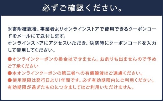 「ファクトリエ」のオンラインストアから、人吉市に製造工場があるHITOYOSHI株式会社で縫製したアイテムを対象にしたオンラインクーポンです。 オンラインストア内の該当商品に対して使用いただけます。 ※寄附確認後、事業者よりオンラインストアで使用できるクーポンコードをメールにて送付します。 オンラインストアにアクセスいただき、決済時にクーポンコードを入力して使用してください。 ■提供サービス メールにて、クーポンコードを送付 【提供フロー例】 お申込み → 寄附者の情報を社内システムに取り込む → 個別にクーポンコード発行 → 寄附者にメールで送信 → 未使用の場合リマインドメール配信 ■備考(注意事項) ●オンラインクーポンの換金はできません。お釣りも出ませんので予めご了承ください ●本オンラインクーポンの第三者への有償譲渡はご遠慮ください。 ●使用期限は発行日より1年間です。必ず有効期限内にご利用ください。有効期限が過ぎたものにつきましてはご利用いただけません。 ■返礼品提供事業者 ライフスタイルアクセント株式会社 ■関連キーワード クーポンコード オンラインストア アパレルショップ ブランド ファクトリエ 日本製 熊本県 人吉市 常温