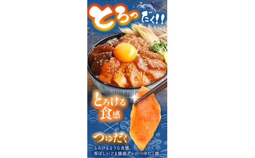 “とろける食感”と“つゆだく感”\\n香ばしいごま醤油だれがたっぷり絡んで、“とろだく”感がたまらない!\\n\\n袋のまま流水で解凍するだけ!\\n炊きたてごはんにのせれば、ツヤっと照りのある切り身がご飯にとろ〜りなじんで、思わずかきこみたくなるおいしさです。\\n\\n刻み海苔や山葵(わさび)を添えるだけでも、風味がぐっと引き立ちます。\\nその日の気分で、味の変化も楽しめる一品です。\\n\\nおすすめなのが、熱々のおだしやお茶をかけて楽しむ“海鮮茶漬け”アレンジ。\\n香ばしさが引き立ち、さらりとした後味で〆にもぴったり。\\n\\n冷凍庫にあると嬉しい、個包装タイプ。\\n忙しい日やちょっと贅沢したい日に、簡単・満足の“とろだく海鮮丼”をぜひどうぞ。\\n\\n【重要なお願い】\\n〇不在日や配送日指定を備考欄に入力いただいても、承ることができない場合がございますので、あらかじめご了承ください。\\n〇画像はイメージです\\n〇年末年始やお盆時期などは発送が遅れる場合がございます。予めご了承下さい。