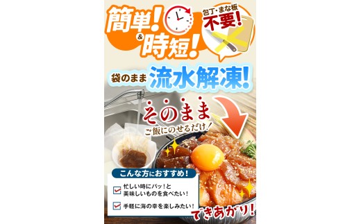 “とろける食感”と“つゆだく感”\\n香ばしいごま醤油だれがたっぷり絡んで、“とろだく”感がたまらない!\\n\\n袋のまま流水で解凍するだけ!\\n炊きたてごはんにのせれば、ツヤっと照りのある切り身がご飯にとろ〜りなじんで、思わずかきこみたくなるおいしさです。\\n\\n刻み海苔や山葵(わさび)を添えるだけでも、風味がぐっと引き立ちます。\\nその日の気分で、味の変化も楽しめる一品です。\\n\\nおすすめなのが、熱々のおだしやお茶をかけて楽しむ“海鮮茶漬け”アレンジ。\\n香ばしさが引き立ち、さらりとした後味で〆にもぴったり。\\n\\n冷凍庫にあると嬉しい、個包装タイプ。\\n忙しい日やちょっと贅沢したい日に、簡単・満足の“とろだく海鮮丼”をぜひどうぞ。\\n\\n【重要なお願い】\\n〇不在日や配送日指定を備考欄に入力いただいても、承ることができない場合がございますので、あらかじめご了承ください。\\n〇画像はイメージです\\n〇年末年始やお盆時期などは発送が遅れる場合がございます。予めご了承下さい。