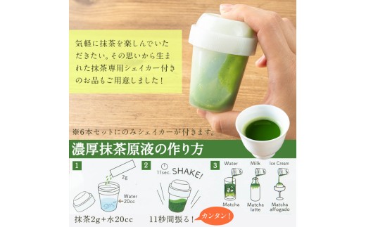 香り高く鮮やかな深緑の色合いとスッキリとした旨味が特徴の上質かごしま抹茶。\\n便利な1杯ずつ飲み切りサイズのスティックタイプとなっています。\\nご自宅用はもちろん、お土産・プレゼントとしてもぜひご利用ください。\\n\\n※抹茶シェイカー6本セットにのみ付いてきます。\\n※選択肢により寄附額や内容は異なりますのでご注意ください。\\n※抹茶シェイカーは、抹茶と水を入れて振るだけで簡単に濃厚抹茶原液を作ることができます。\\n\\n国産 九州産 鹿児島県産 日本茶 抹茶 緑茶 粉末 まっちゃ お茶 小分け 簡単