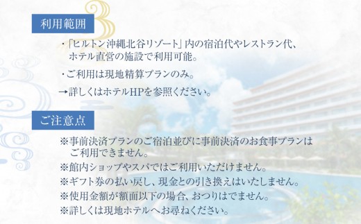 ◆お礼品の内容について 「ヒルトン沖縄北谷リゾート」5000円ギフトバウチャーx90枚 450、000円相当 サービス提供地:沖縄県中頭郡北谷町字美浜 ◆ギフトバウチャー対象施設 「ヒルトン沖縄北谷リゾート」内の宿泊代やレストラン代、ホテル直営の施設でご利用いただけます。 事前決済プランのご宿泊並びに事前決済のお食事プランはご利用できません。現地精算のプランにてご利用いただけます。 館内ショップやスパではご利用いただけません。 ◆有効期限 発行日~1年後の同日 ◆ご利用可能期間 通年 ◆注意事項・その他 ※寄付お申し込み受付後、ヒルトン沖縄北谷リゾートよりヒルトンギフトバウチャーを送付いたします。 ※ギフトバウチャーは必ずお持ちください。ご持参なしの場合、事由に関わらず利用が出来ません。 ※ギフトバウチャーは期限迄に必ずご利用ください。期日を過ぎた宿泊券はご利用頂けません。 ※ご利用金額が額面以下の場合、差額分を現金で返金することは出来かねます。 ※ギフトバウチャーの払戻、換金、転売(ネットオークションなど含む)はできません。 ※寄付申込み後のキャンセルはご対応できかねます。 ※画像はイメージです。 ※宿泊やレストランは事前のご予約を推奨いたします。 ※「ヒルトン沖縄北谷リゾート」内の宿泊代やレストラン代、ホテル直営の施設でご利用いただけます。 事前決済プランのご宿泊並びに事前決済のお食事プランはご利用できません。現地精算のプランにてご利用いただけます。 館内ショップやスパではご利用いただけません。 ※本ギフトバウチャーご利用の場合はフロントまたはレストラン受付にてご提出をお願い致します。 ※北谷町ふるさと納税の宿泊権利は、譲渡したり現金と交換したりすることはできません。 事業者名:ヒルトン沖縄北谷リゾート 連絡先:098-901-1111 関連キーワード:宿泊 チケット 人気 おすすめ ホテル 割引 人気ホテル おすすめ 旅行 観光 宿 ふるさと納税
